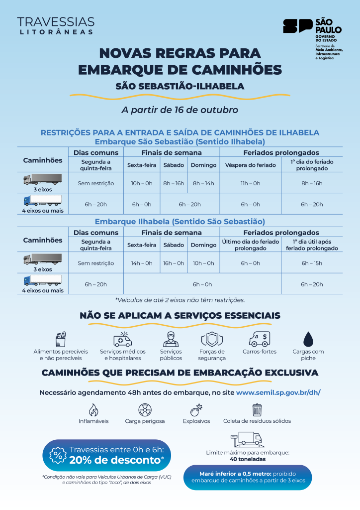 Com o objetivo de garantir mais fluidez na operação na Travessia São Sebastião-Ilhabela, a partir desta segunda-feira (16), entram em vigor as novas regras para embarque de caminhões e transporte de cargas. A medida é parte das ações desenvolvidas pela Secretaria de Meio Ambiente, Infraestrutura e Logística (Semil) com o intuito de otimizar o sistema de balsas. Serviços essenciais não serão afetados pela nova resolução, publicada no Diário Oficial na última semana. Caminhões que aderirem ao horário alternativo de embarque, entre 0h e 6h, terão 20% de desconto na tarifa.