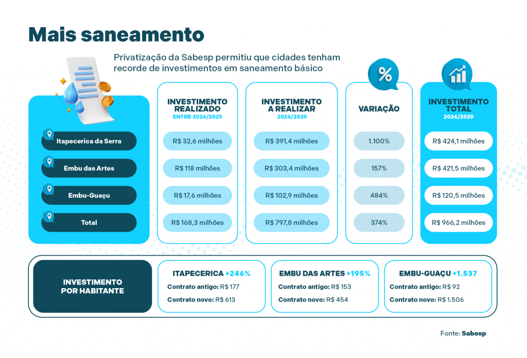 Desde a desestatização, em 2024, a companhia vem acelerando os investimentos em saneamento e resiliência hídrica na região de Itapecerica. No biênio 24/25, com obras firmadas ainda pelo contrato com modelo estatal, foram gastos R$ 168 milhões. Com o novo contrato, nos próximos quatro anos a Sabesp vai investir mais R$ 797,8 milhões em obras nas três cidades, quase cinco vezes mais do que foi investido nos dois primeiros anos após a desestatização.
