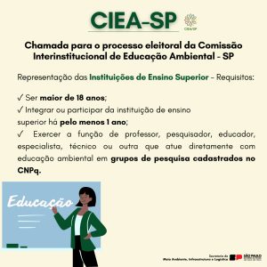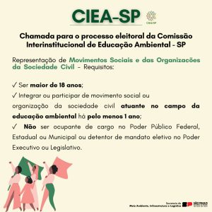 Para saber mais e se inscrever acesse os editais: https://semil.sp.gov.br/educacaoambiental/evento/ciea-sp-chamada-para-o-processo-eleitoral-da-comissao-interistitucional-de-educacao-ambiental-sp/ https://semil.sp.gov.br/educacaoambiental/evento/ciea-sp-chamada-para-o-processo-eleitoral-da-comissao-interinstitucional-de-educacao-ambiental-sp-3/