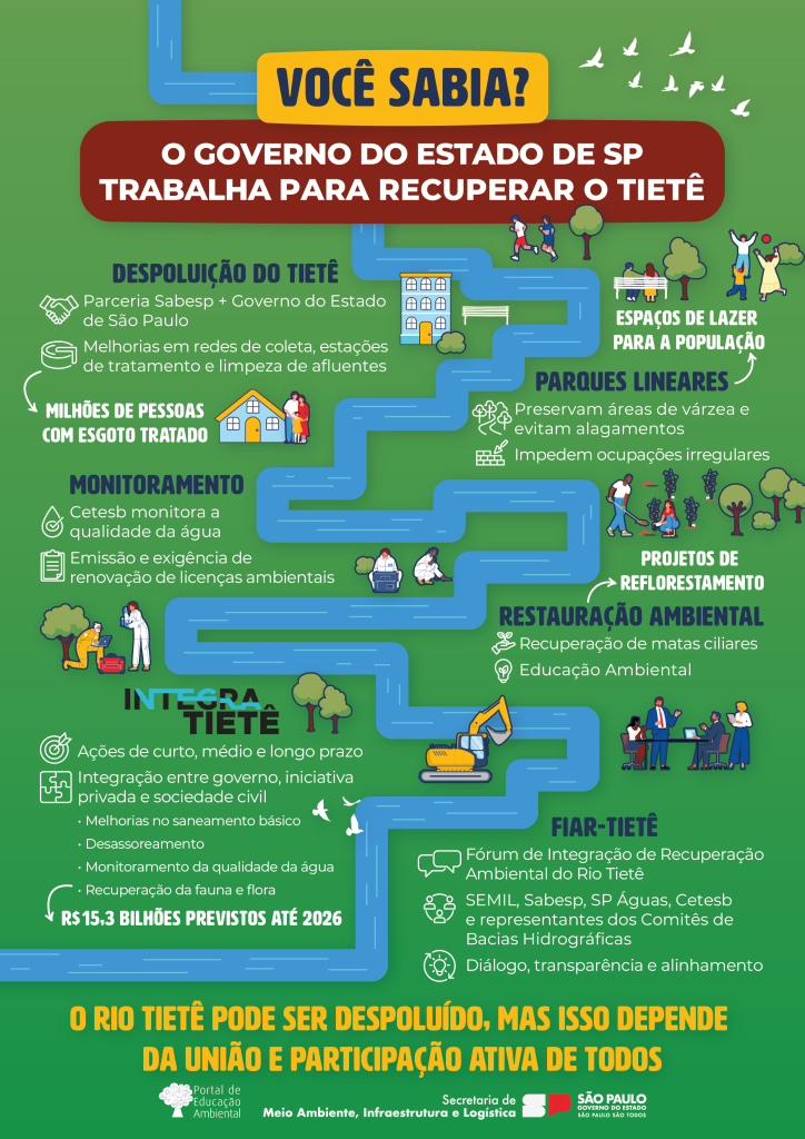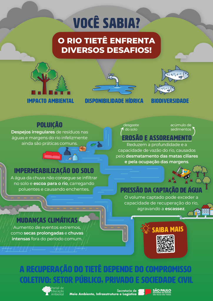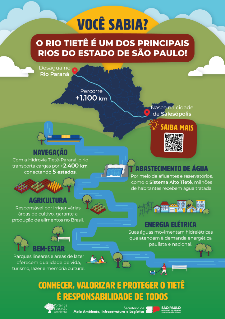 O Rio Tietê é um dos principais rios do estado de São Paulo. Ele nasce na Serra do Mar, no município de Salesópolis, a apenas 22 quilômetros do oceano, porém, apesar dessa proximidade, ele corre para o interior por mais 1.100 km, até desaguar no rio Paraná, no município de Itapura, após ter atravessado 62 municípios paulistas. Ao mesmo tempo em que desempenha funções fundamentais para o desenvolvimento econômico, social e cultural, enfrenta sérios desafios ambientais, que refletem o impacto da ação humana e a necessidade urgente de políticas públicas e de mobilização social.