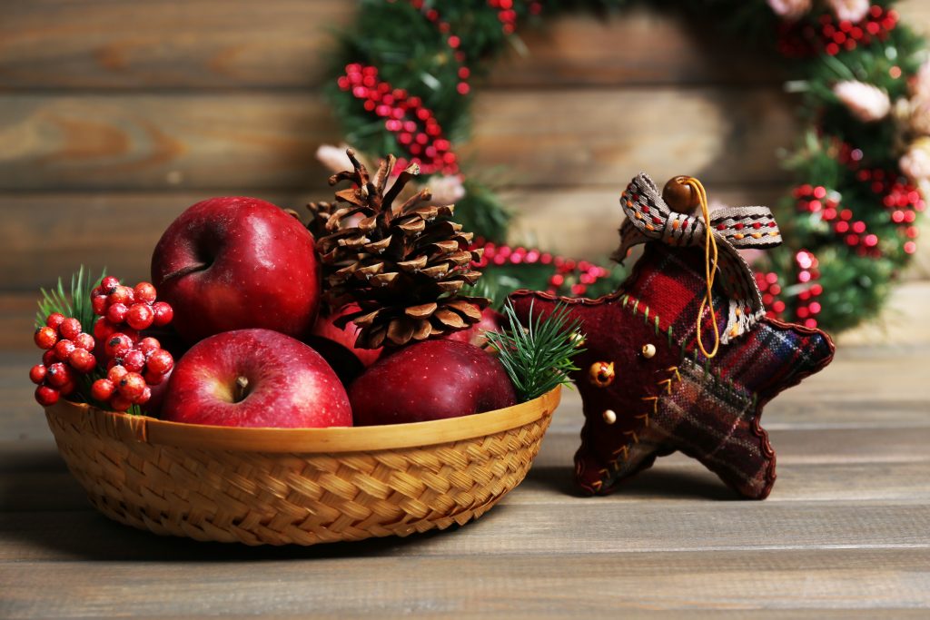 - A decoração da mesa para a ceia de Natal pode ser feita, por exemplo, com alimentos, frutas e folhas.