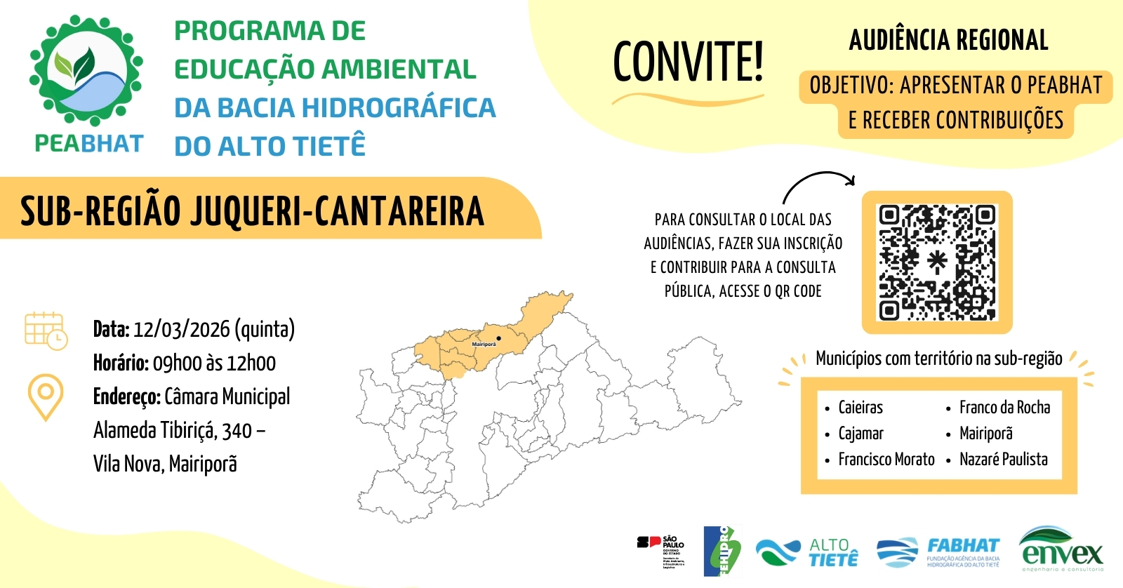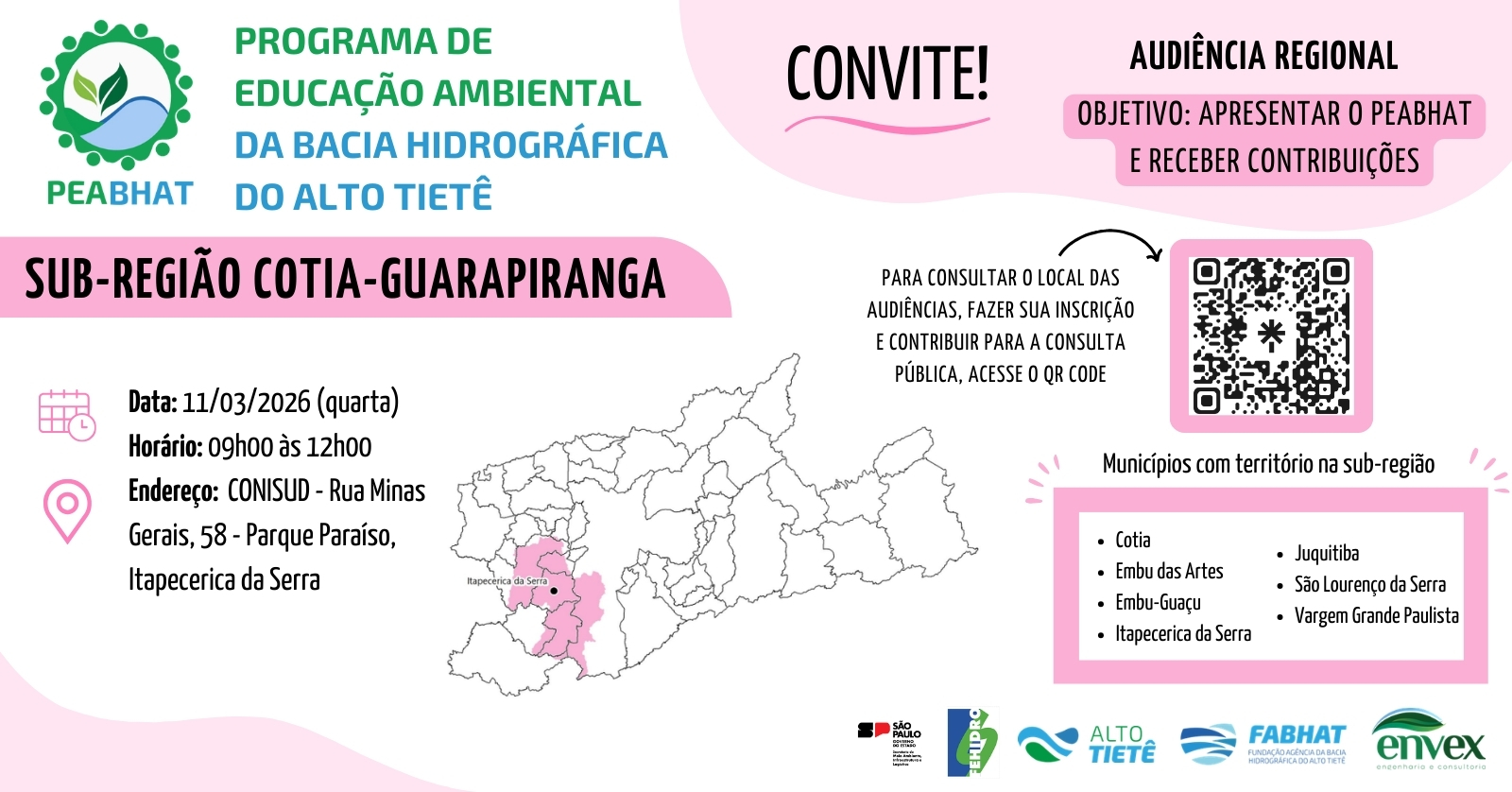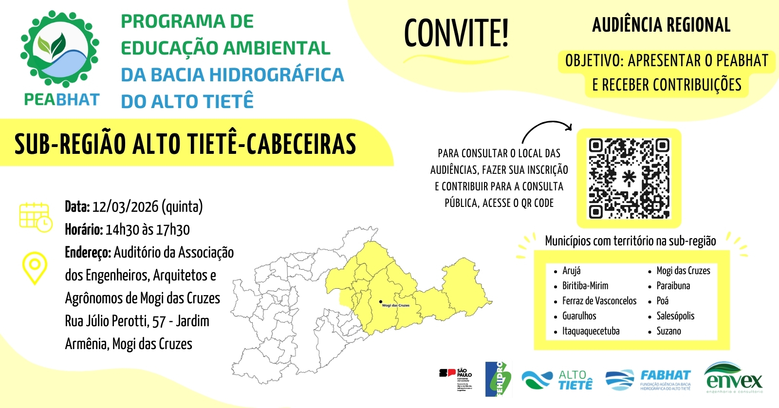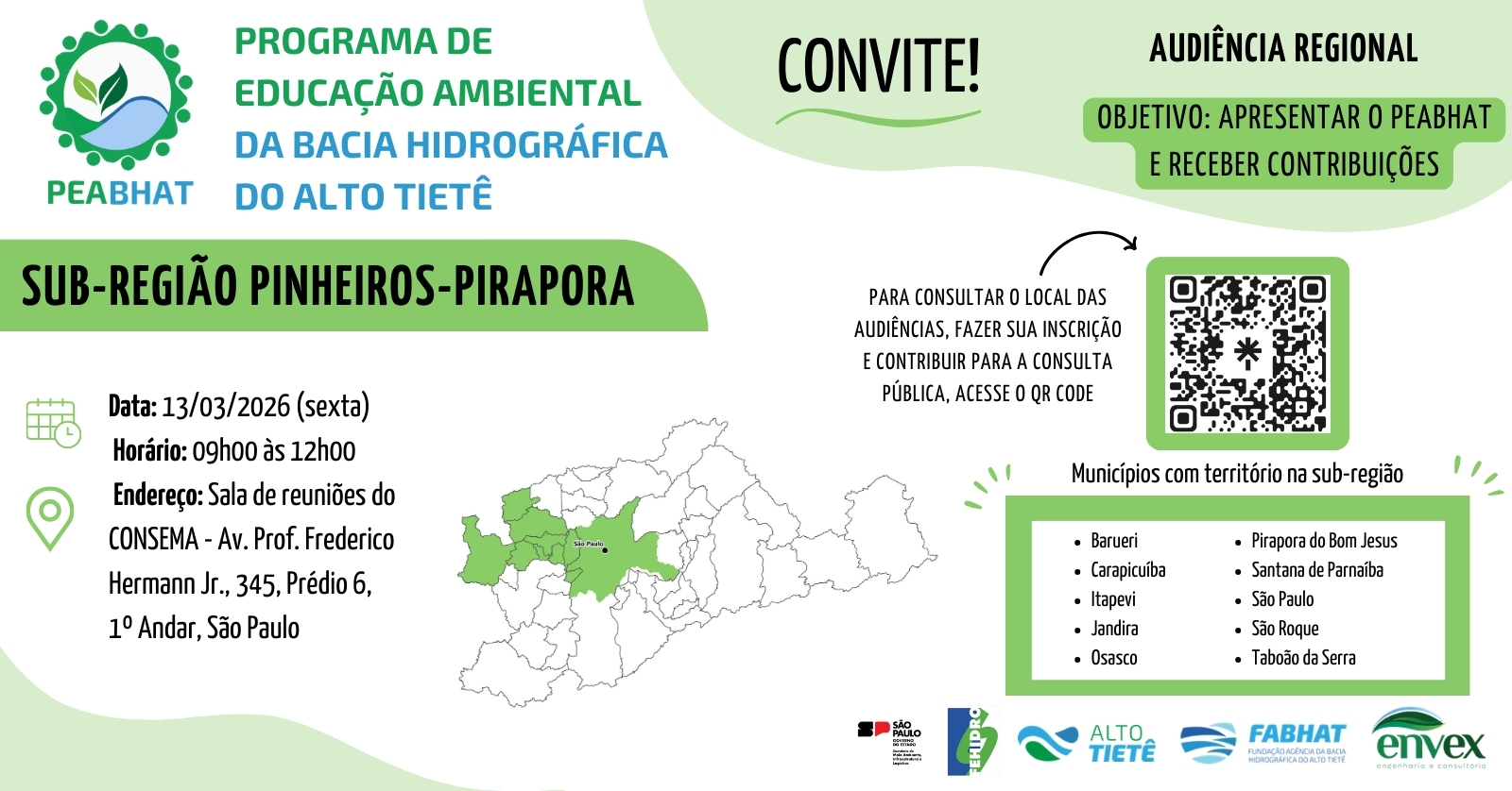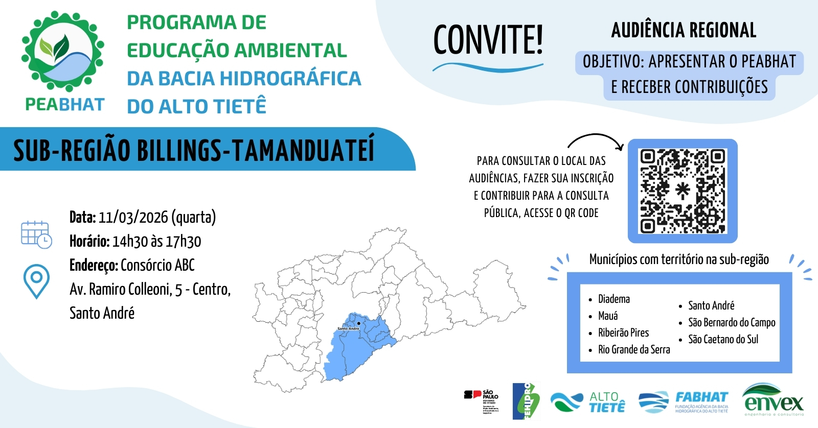 Convidamos para a última rodada de participação social do Programa de Educação Ambiental da Bacia do Alto Tietê - PEABHAT! O Programa é financiado com recursos do FEHIDRO e tem […] |