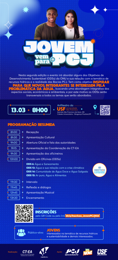 Para participar, é necessário realizar a inscrição pelo link: https://bit.ly/Inscricao_JovemPCJ2024. O evento ocorrerá de forma presencial no Auditório do campus de Bragança Paulista da Universidade São Francisco (USF), localizado na Av. São Francisco de Assis, nº 218 – Cidade Universitária, Bragança Paulista/SP.