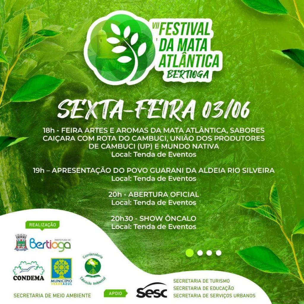 O tradicional Festival da Mata Atlântica de Bertioga acontecerá do dia 3 a 5 de junho, na Tenda de Eventos. Em sua sétima edição, o evento terá uma extensa programação gratuita com feiras, shows, gastronomia e oficinas, além da participação do movimento de Economia Solidária do município (EcoSol Bertioga).