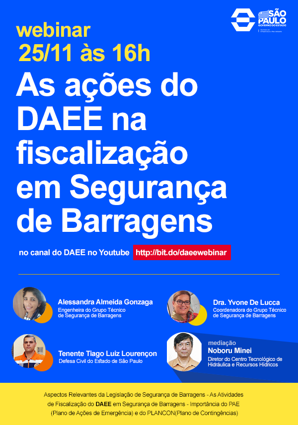 Nesta quarta-feira, 25 de Novembro, o Departamento de Águas e Energia Elétrica promove um Webinar sobre as Ações da Autarquia na Fiscalização em Segurança de Barragens. O seminário online terá duração de 60 min com transmissão ao vivo, a partir das 16h, no canal do DAEE no Youtube.