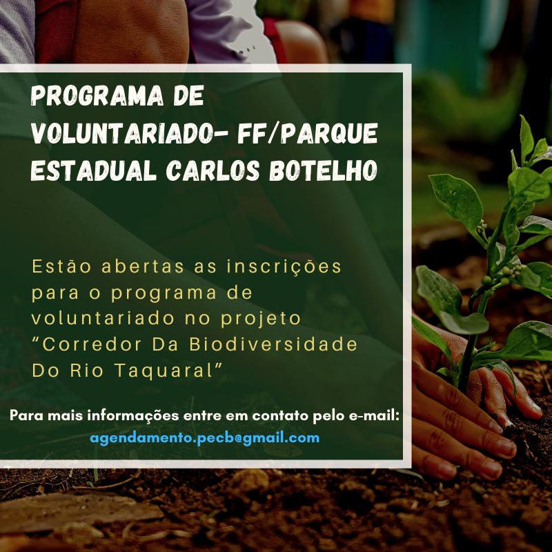 Programa de Voluntariado – FF/ Parque Estadual Carlos BotelhoParque Estadual Carlos Botelho juntamente com a Secretaria de Meio Ambiente de São Miguel Arcanjo estão convocando voluntários para o Programa de Voluntariado Fundação Florestal, para os trabalhos junto ao Corredor da Biodiversidade do Rio Taquaral. Para mais informações os interessados deverão entrar em contato através do […]