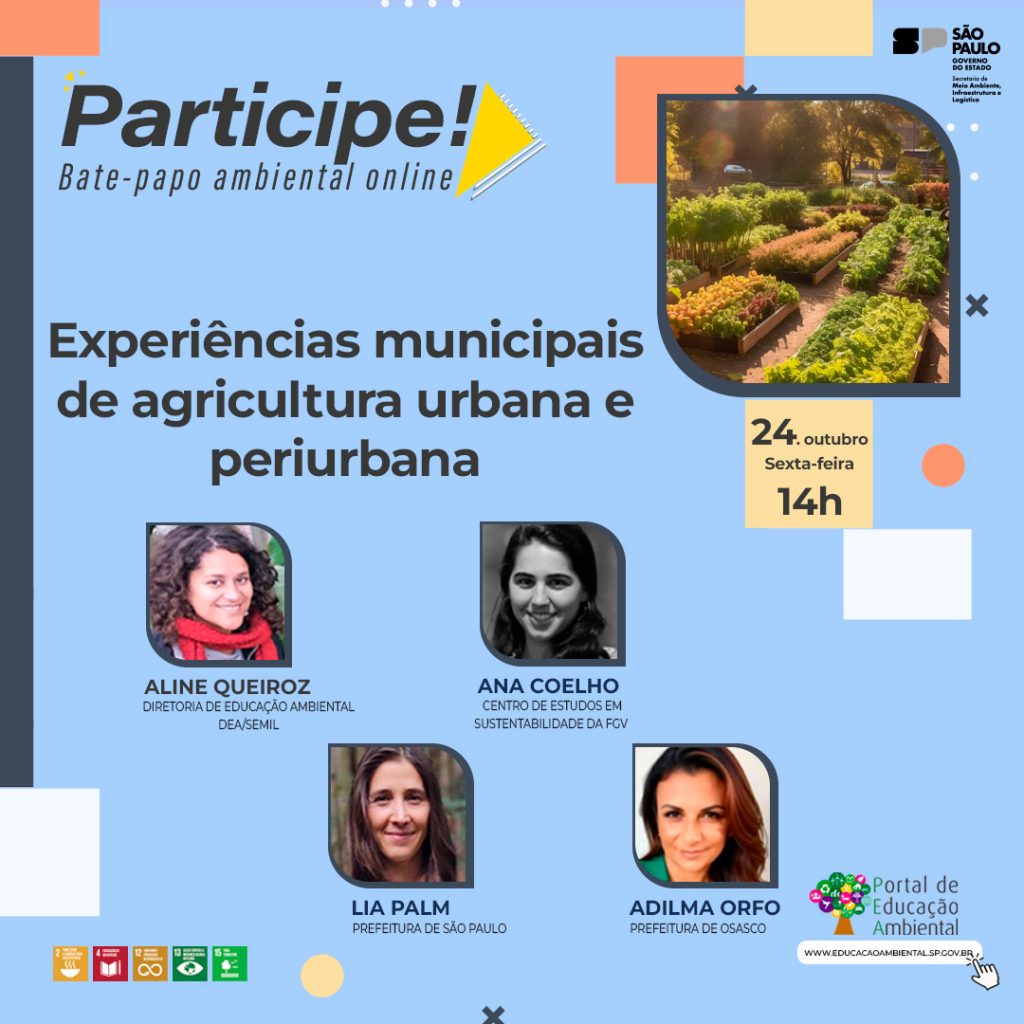 Neste segundo dia de Participe! vamos conhecer as experiências de São Paulo e Osasco, municípios que possuem programas de referência em agricultura urbana e periurbana, reconhecidos nacional e internacionalmente. Vamos explorar as características destes programas, o público atendido, os benefícios gerados e os instrumentos e estratégias para a sua consolidação nos municípios.