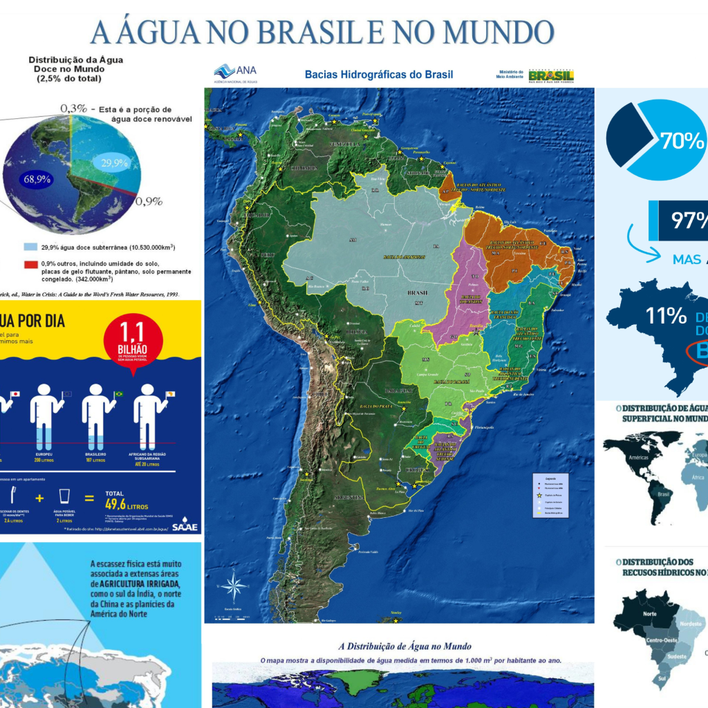 O cartaz: “A água no Brasil e no Mundo”, produzido pela Agência Nacional de Águas (ANA), apresenta as informações mais importantes sobre a distribuição e o uso da água, no Brasil e no mundo. O cartaz destaca que, embora o Brasil possua, aproximadamente, 12% dos recursos de água doce do planeta, essa distribuição é desigual, com alta concentração na região amazônica, enquanto áreas povoadas enfrentam escassez.