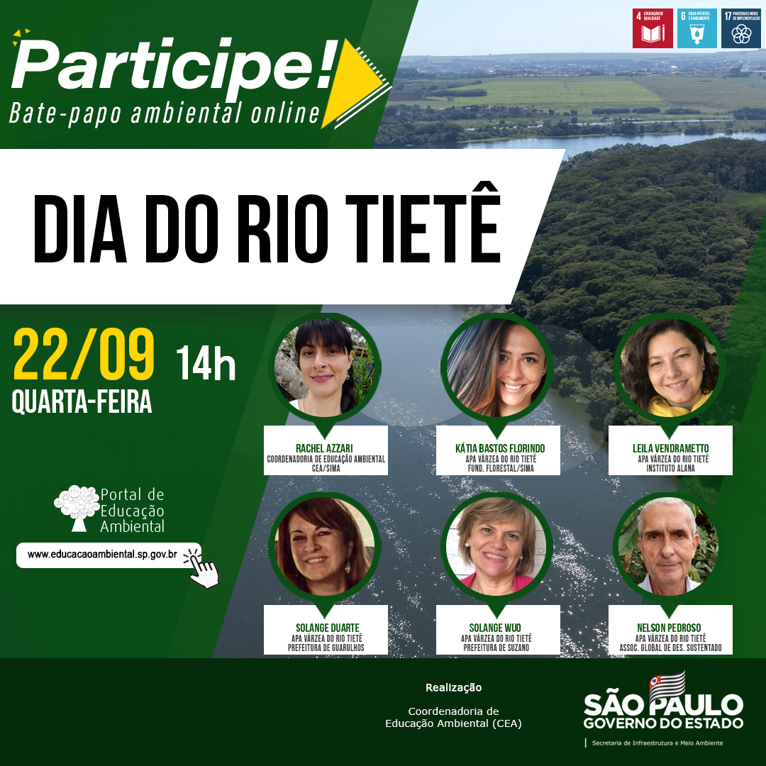O tema é Dia do rio Tietê e participam Katia Florindo, da Fundação Florestal e presidente do CAPAVRT; Leila Vendrametto, do Instituto Alana e coordenadora da CTEA/ CCAPAVRT; Nelson Pedroso (da Associação Global de Desenvolvimento Sustentado e Conselheiro do CAPAVRT; Solange Wuo da Prefeitura de Suzano e Conselheira do CAPAVRT); e Solange Duarte (Prefeitura de Guarulhos e Conselheira do CAPAVRT), para abordar a história do Rio Tietê e sua importância, o papel do Conselho Consultivo e da atuação dos municípios, e o que é preciso fazer para que possamos continuar celebrando sua existência.
