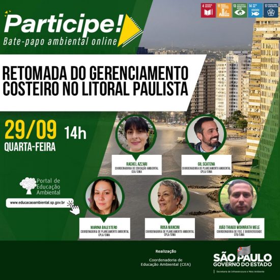 E, para dar mais detalhes e informações sobre a Retomada do GERCO, participam Gil Scatena, Rosa Maria Mancini e Marina Balestero, da Coordenadoria de Planejamento Ambiental; e João Thiago Wohnrath Mele, da Coordenadoria de Fiscalização e Biodiversidade.