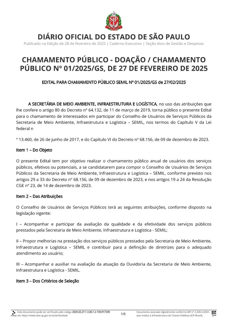 O Chamamento Público nº 01/2025/GS, publicado em 27 de fevereiro de 2025 pela Secretaria de Meio Ambiente, Infraestrutura e Logística (Semil) do Estado de São Paulo, convida usuários de serviços públicos, efetivos ou potenciais, a se candidatarem para integrar o Conselho de Usuários de Serviços Públicos da Semil. O objetivo é acompanhar e avaliar a qualidade dos serviços prestados, propor melhorias e auxiliar na atuação da Ouvidoria.