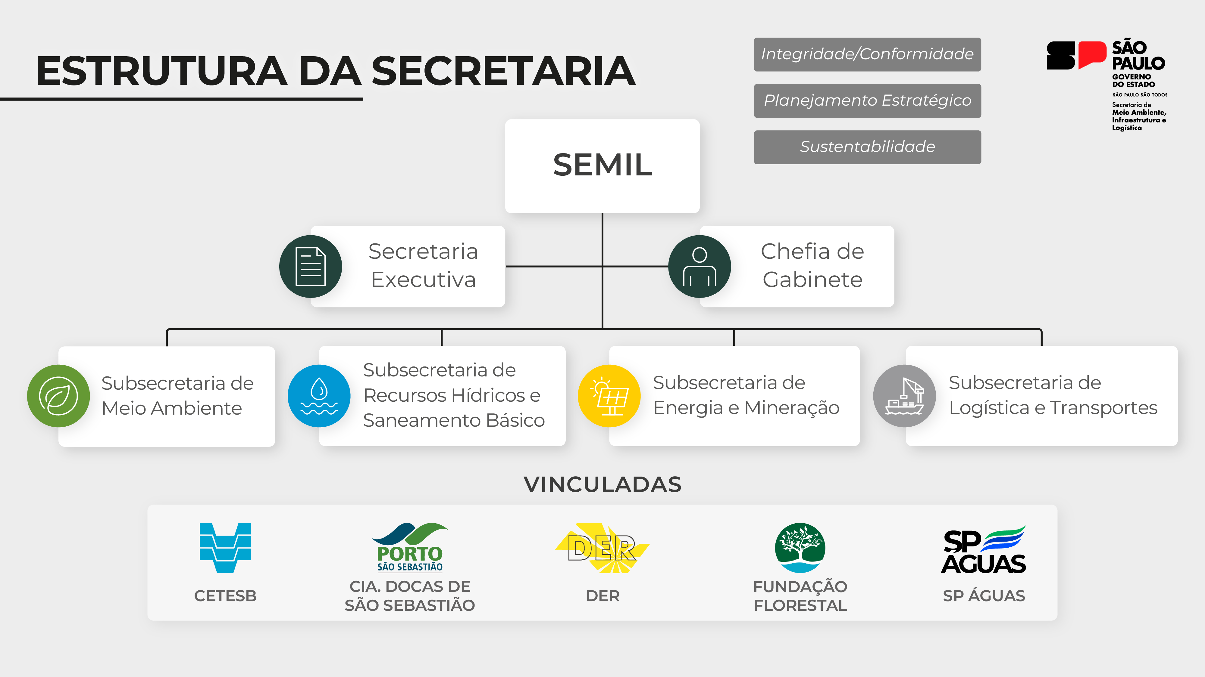 A Secretaria de Meio Ambiente, Infraestrutura e Logística – SEMIL foi criada pelo Decreto nº 67.435, de 1º de janeiro de 2023, permitindo a integração de ações de planejamento, bem como a execução das políticas públicas estaduais relacionadas ao meio ambiente, aos recursos hídricos e expansão e melhoria do saneamento básico, à produção de energia e a realização da mineração sustentável e a qualidade da prestação de serviços logísticos e das rodovias estaduais.