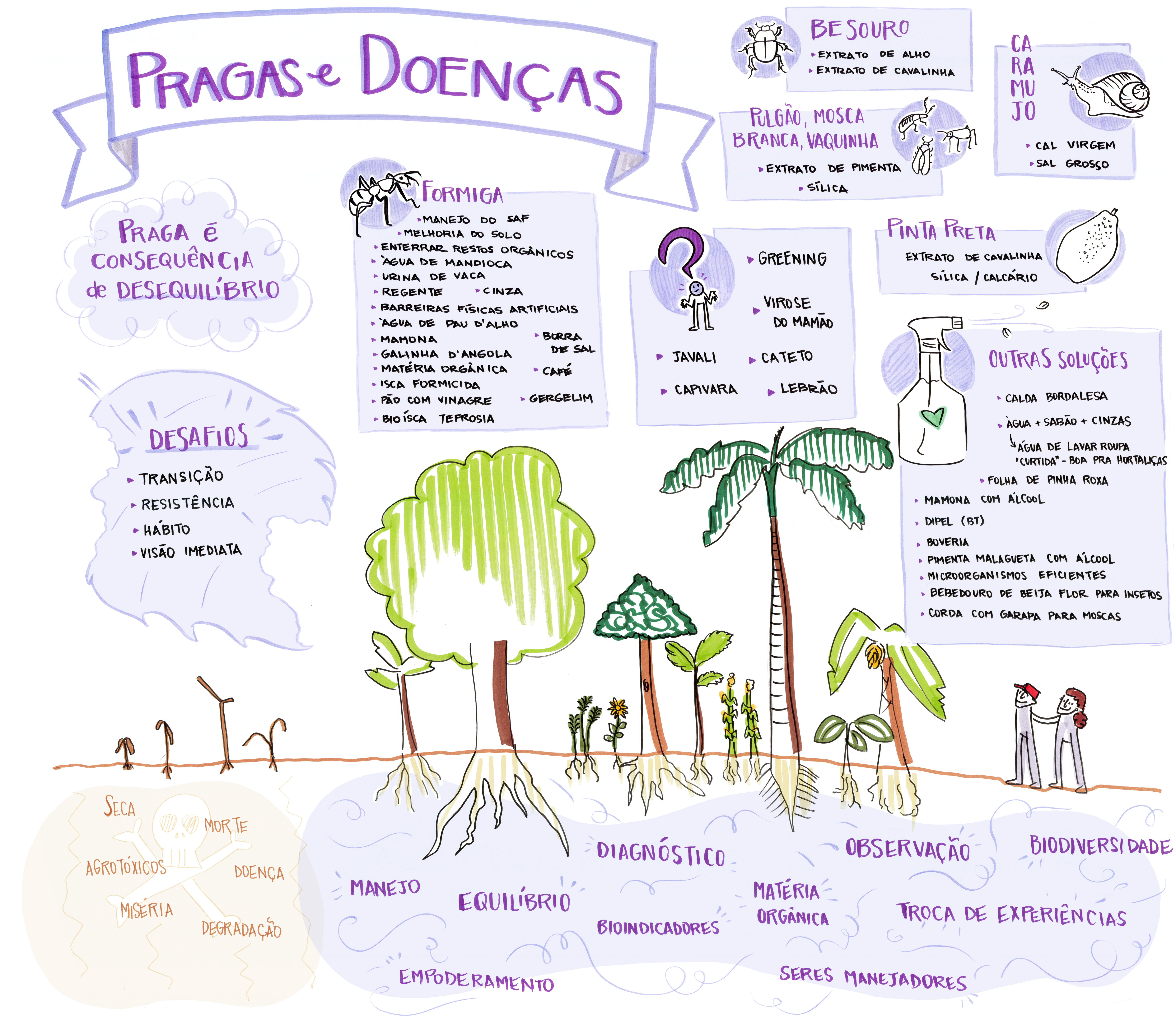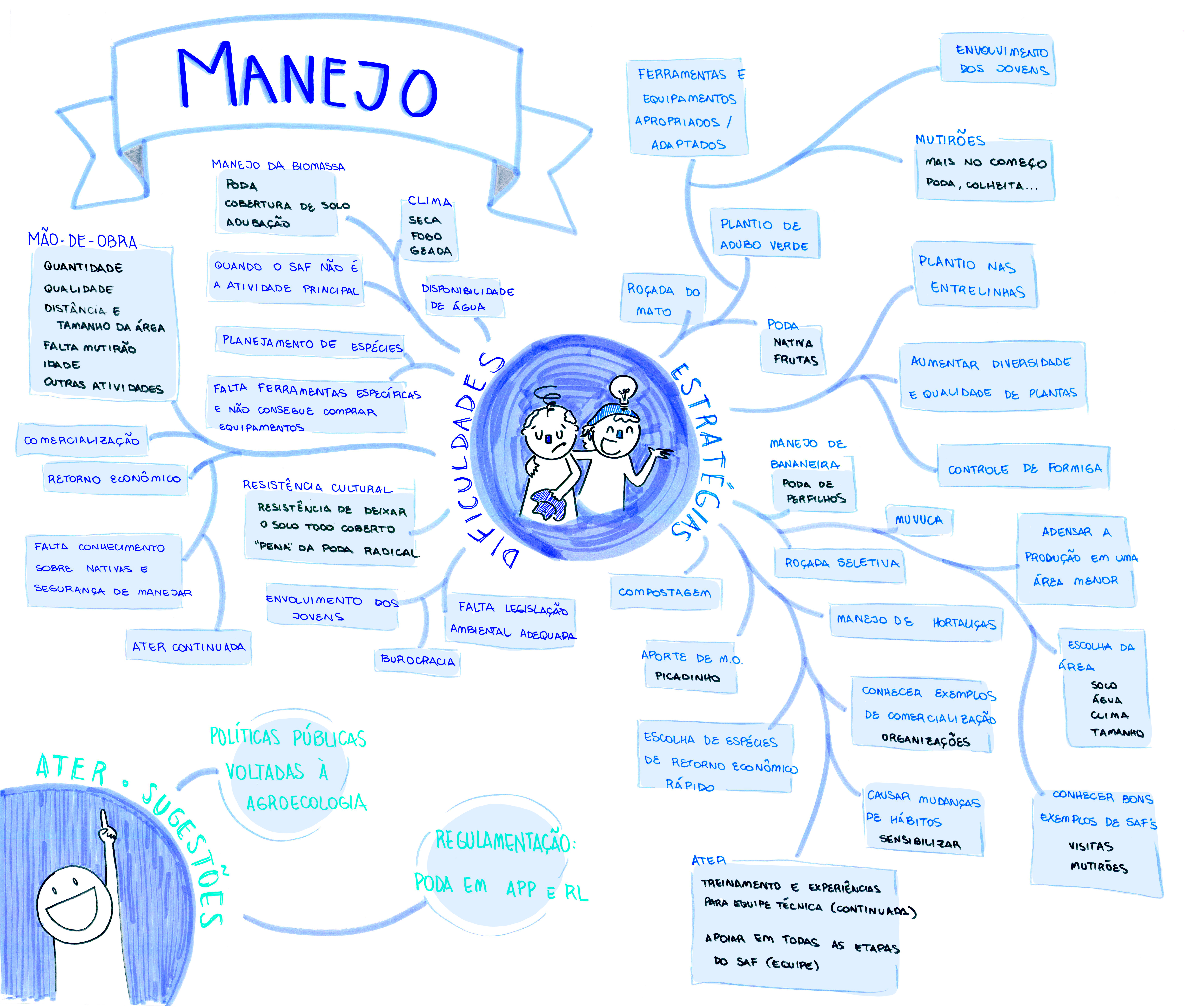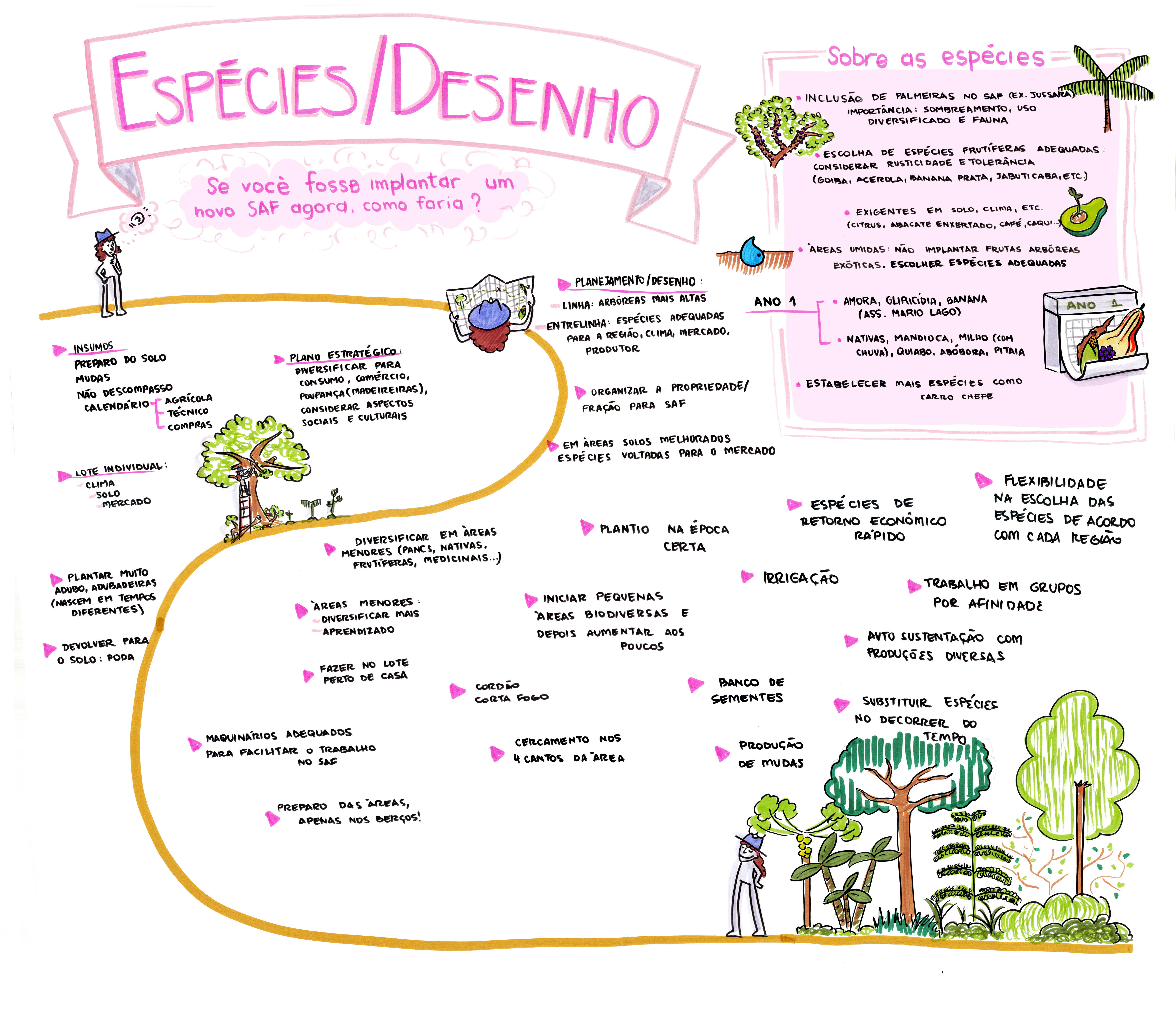 Como resultado de um processo de implantação de mais de 600hectares de SAFs durante o PDRS, compartilhamos algumas dicas elaboradas a partir do dia a dia dos agricultores familiares e sistematizadas em três figuras referentes à seleção de espécies, manejo agroflorestal e controle de pragas e doenças.